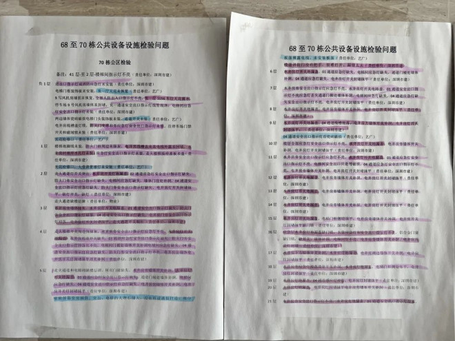 记者走访现场看到,项目外侧的底商还未招商成功,底商门口停满了车辆,小区内部开设有便利店等生活设施。在70栋楼下,张贴着《68至70栋公共设备设施检验问题》文件,密密麻麻罗列了每层公区的问题,包括楼道消防门没有门把手、水井房开关灯地漏盖、走火通道和电梯间缺楼层牌等问题。