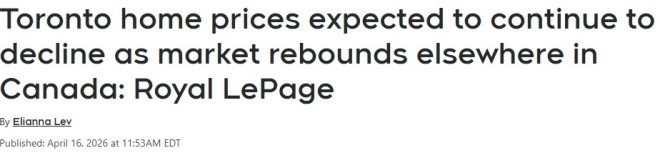 Royal LePage 预测,2026 年第四季度,GTA 房屋综合均价将较 2025 年同期再跌 4.5%。